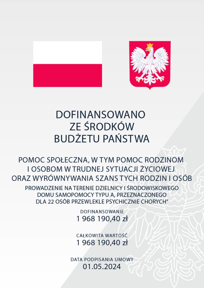 Nazwa zadania: „Prowadzenie na terenie Dzielnicy I środowiskowego domu samopomocy typu A, przeznaczonego dla 22 osób przewlekle psychicznie chorych”.
