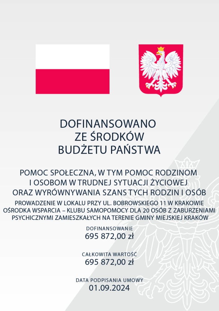 Prowadzenie Klubu Samopomocy w Krakowie, ul. Bobrowskiego 11 to realizacja zadania publicznego w zakresie: „Pomoc społeczna, w tym pomoc rodzinom i osobom w trudnej sytuacji życiowej oraz wyrównywania szans tych rodzin i osób”, wykonywana w okresie od 01.09.2024 r. do 31.08.2027 r., na podstawie umowy nr W/DOT/24/MOPS/24/2024, zawartej pomiędzy Gminą Miejską Kraków a Krakowską Fundacją Hamlet.